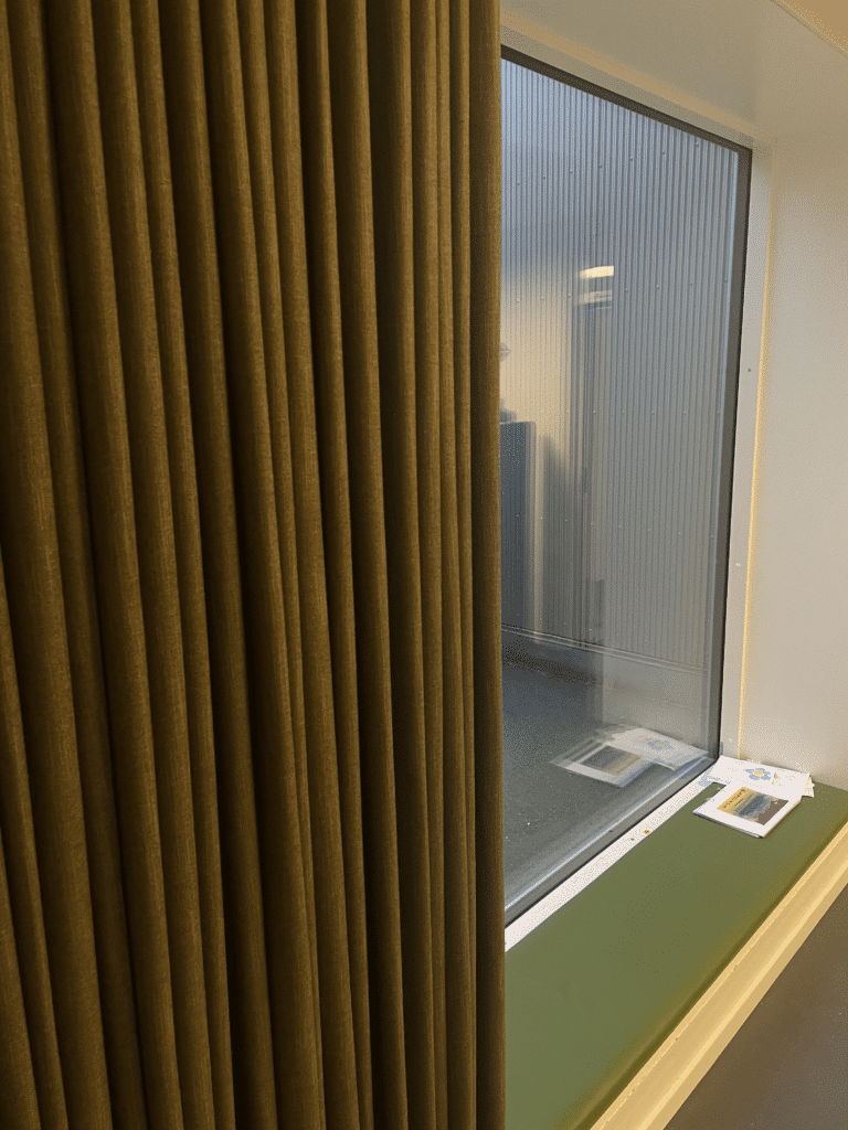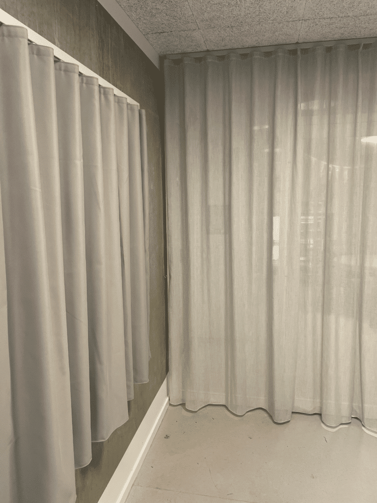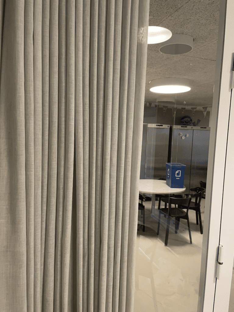 Løsningerne er udført i oeko-tex-certificerede tekstiler og monteret med skinnesystemer udviklet specifikt til miljøer med høj aktivitet og mange daglige brugere. Det sikrer, at både tekstiler og ophæng kan holde til gentagen brug, bevægelse og skiftende behov, uden at gå på kompromis med det æstetiske udtryk.