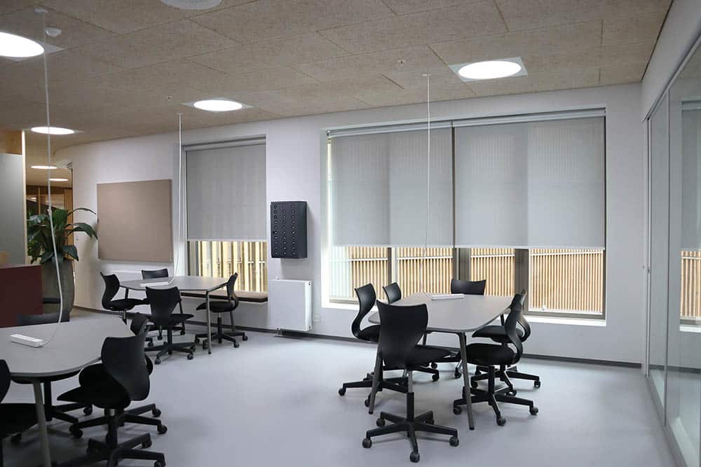 Screenvævet reducerer effektivt skarpt sollys og varme, samtidig med at det muliggør udsyn. Det skaber et optimalt læringsmiljø med både komfort og visuel åbenhed.